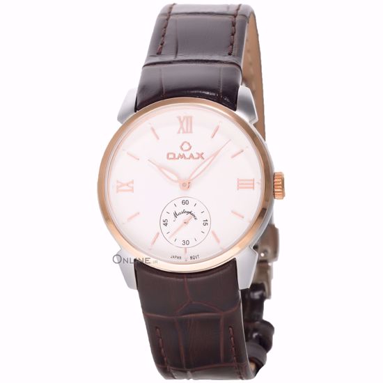 ساخت ژاپن - ساعت مچی بند چرمی قهوه ای ، صفحه سفید دور رزگلد زنانه اوماکس ML0C35I - ست (زنانه مردانه) - زیر ثانیه در صفحه - 2 سال گارانتی