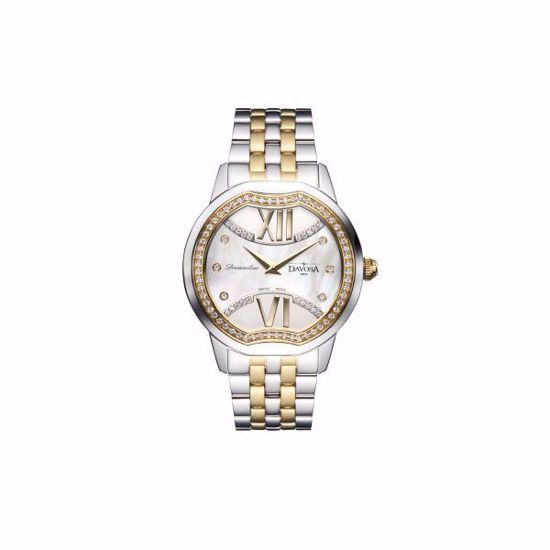 ساخت سوئیس - ساعت مچی بند استیل طلایی نقره ای، صفحه سفید صدفی دور نگین دار طلایی اصل زنانه داووسا 16857715/20011 - نگین دار - استیل ضد زنگ - 2 سال گارانتی