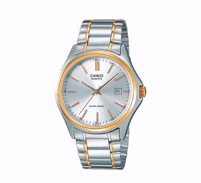 ساخت ژاپن - ساعت مچی بند استیل نقره ای طلایی، صفحه نقره ای براق دور طلایی مردانه کاسیو MTP-1183G-7ADF - نشانگر تاریخ - 1 سال گارانتی