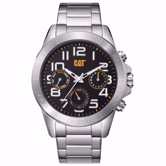 این طرح از ساعت مچی های مردانه برند کاترپیلار مناسب برای تیپهای اسپرت است و دارای بند و بدنه ی استیل می باشد و از ترکیب رنگ های مشکی و سفید و زرد و نقره ای در آن استفاده شده است. این ساعت با طراحی خاص صفحه و بدنه اش چشم هر بیننده ای را مینوازد. این طرح از ساعت کت فول دیت بوده و عقربه های کوچک آن نمایشگر روزهای ماه و هفته و وضعیت 24 ساعته میباشد.